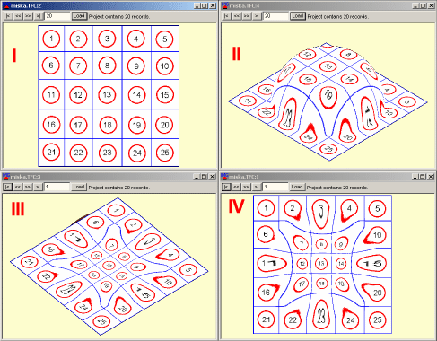 This example shows how image pre-distortion works in T-SIM. Image pre-distortion, as implemented in T-SIM, is easy to understand and use. A flat 2D image (I), represented by BMP or JPG file, is projected (II) from plane onto the surface of the final product (a bowl).Then, just by clicking one button, it is possible to go back in time to the initial stage of the process, where the sheet is flat (III). The final pre-distorted image (IV) is heavily distorted when compared with the original projected image (I).